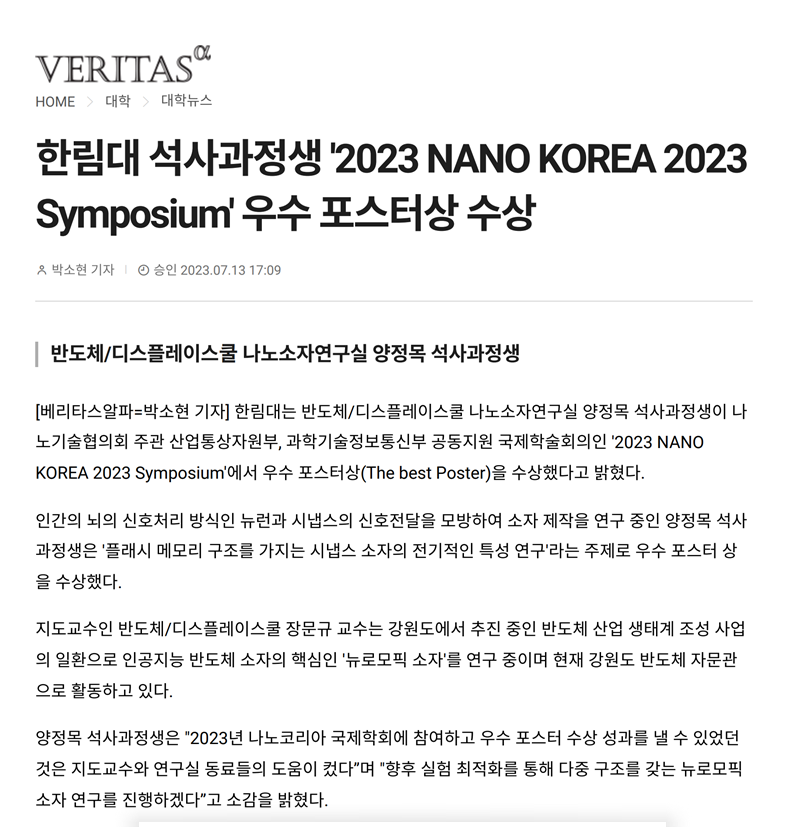 한림대 석사과정생 '2023 NANO KOREA 2023 Symposium' 우수 포스터상 수상